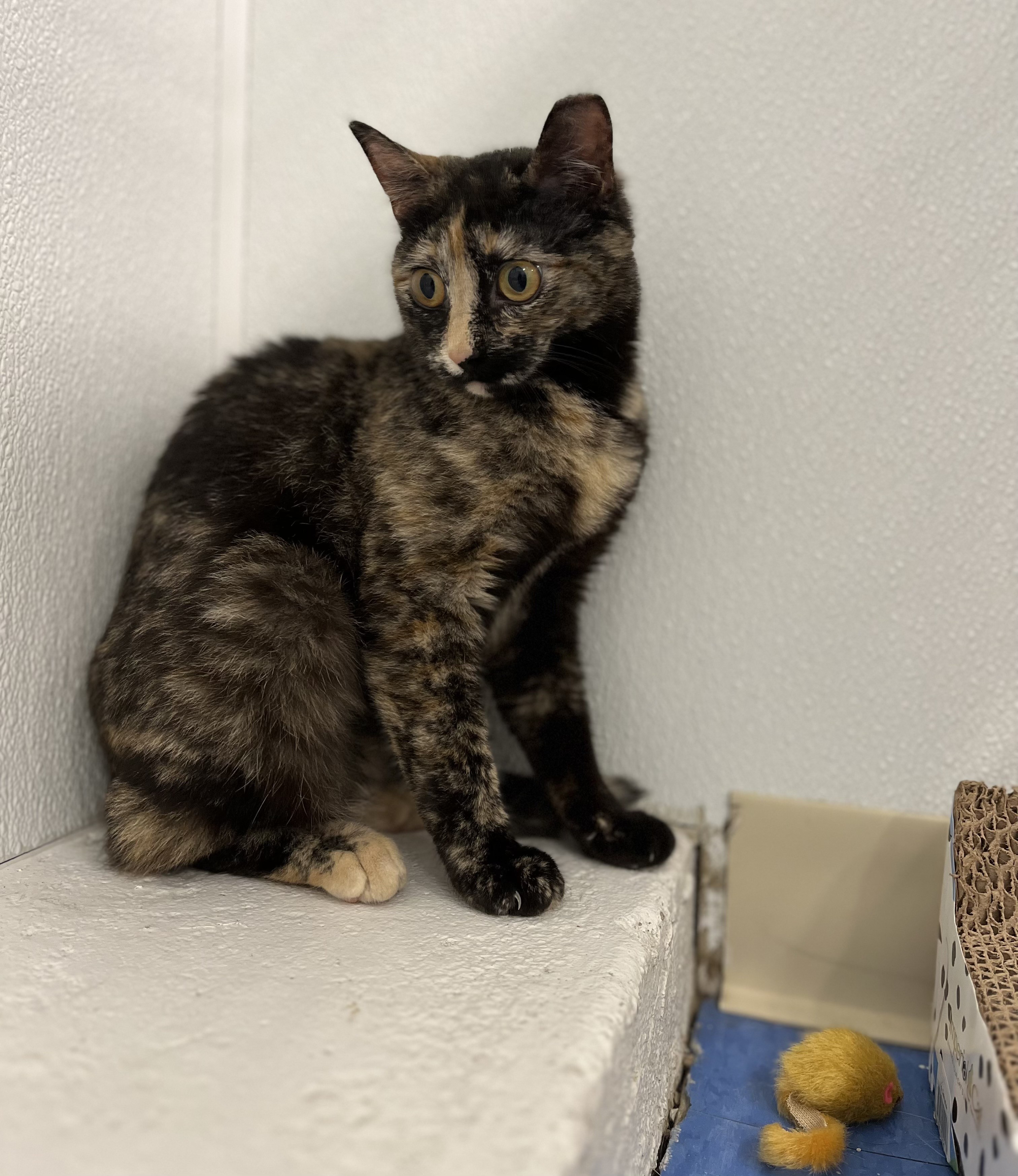 Born September 2024 This petite girl is a classic Tortie. She loves to play and watch the world around her. Waverly's favorite toy is a small mouse that she tosses high into the air and runs to catch. She is a bit shy at first but turns into a purr machine as soon as you gain her trust. Waverly is comfortable with other cats but would prefer to be in a home without dogs.