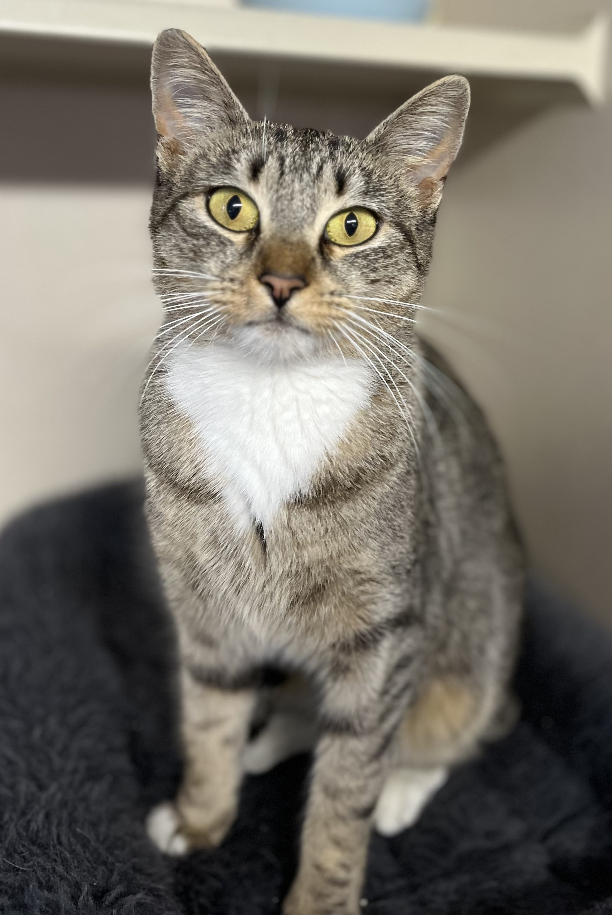 Born January 2022 Eve is a petite tabby girl with a sweet temperament. She enjoys spending time with her human friends and frequently leans in with head bumps to ask for attention. Eve is quiet but playful. Her favorite toys are small mice and soft balls. She also enjoys batting wand toys if you have time to play. Eve will join you on any soft snuggly spot you're willing to share. She's not a fan of hugs but pets are always rewarded with purrs. No dogs please.